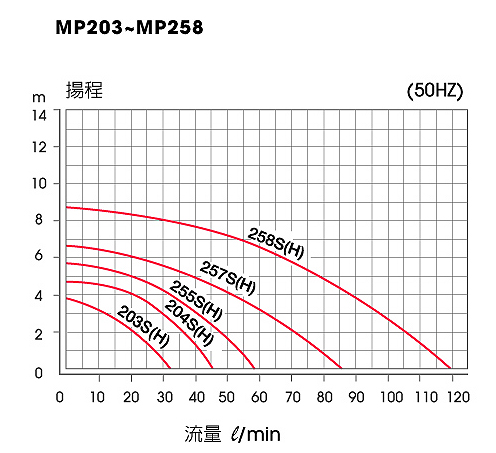 | Max. Head | 50Hz | (M) | 3.8 | 4.6 | 5.6 | 6.7 | 8.6 |